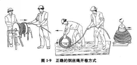 鋼絲繩通常總是成卷(盤)供應(yīng)的,一卷鋼絲繩的長度有多種規(guī)格,如250m、500m和1000m等。多層建筑施工用的塔式起重機(jī)的起升鋼絲繩通常為100-150m,而中高層建筑施工用的塔式起重機(jī)的起升鋼絲繩長尾250-350m,超高層建筑施工用的塔式起重機(jī)的起升鋼絲繩往往長度達(dá)500m或更長一些。鋼絲繩的開卷方式如圖1-9所示。