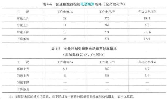 被測電動葫蘆基本參數:額定起重量5t;額定起升速度8m/min;電動機額定功率7. 5kW。試驗工況:起吊2t載荷提升至2m。測試其離地上升和下降落地時的瞬態沖擊電流、瞬態沖擊功率和勻速上升和下降時的穩態工作電流和穩態有功功率,其測試數據見表4-6和表4-7。表4-6普通接觸器控制電動葫蘆能耗(起吊載荷2t)