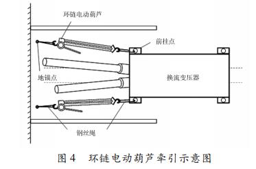 電動葫蘆根據牽引材料不同分為鋼絲繩和環鏈電動葫蘆,在同等規格條件下,環鏈電動葫蘆在運行距離、使用壽命、定位精度等方面均具有優勢。為確保換流變平穩牽引,采用兩臺環鏈電動葫蘆同步牽引,用牽引鋼絲繩、卸扣以及環鏈電動葫蘆將換流變與地錨連接在一起,如圖4所示。