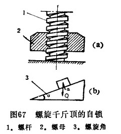 ? 當螺旋角大于摩擦角(即α>φ)時,被頂起的重物在自重作用下,自動產生下滑的現象,成為自落。LQ—50型螺旋千斤頂采用梯形雙線螺桿,其螺旋角大于摩擦角,這種螺旋千斤頂則具有自落能力。故重物被頂升后,需要停止時,另設有制動裝置。
