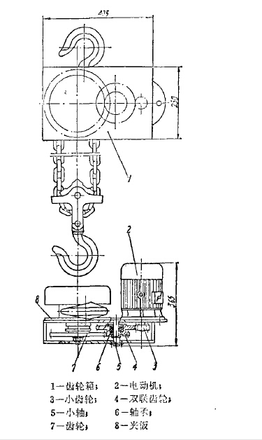 ? 某些場合因為三噸手動葫蘆操作速度低、勞動強度較大,所以在原有墓礎上,將手動葫蘆改為電機齒輪傳動,來提高丁生產效率,滿足了生產要求。具體的改裝示意圖如圖1。將原來手動葫蘆的鏈條和手鏈輪拆除,在夾板8上用螺釘固定齒輪箱1,1.1千瓦電動機固定在齒輪箱上。通過小齒輪3和雙聯齒輪4,傳到與手拉葫蘆主軸用三頭螺紋聯接的齒輪7上。操縱電機的反正轉,即可平穩地提取或放下重物。