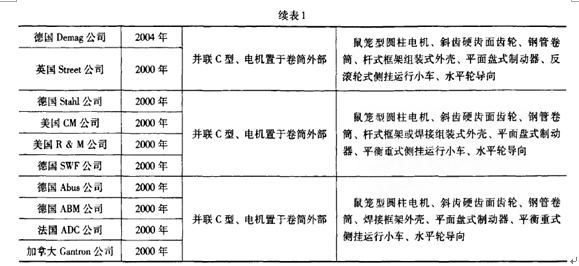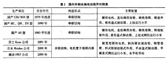 目前,國內(nèi)外電動葫蘆產(chǎn)品存在構(gòu)造特征、性能配置等方面仍存在一定差異,通過對國內(nèi)外該類產(chǎn)品的比較,明示了其差異情況。如下表所示,1964年聯(lián)合設(shè)計的CD/MD葫蘆,在1975年設(shè)計改進(jìn)之后,雖然各制造企業(yè)不同程度的改進(jìn),并未吸收世界進(jìn)程中的任何技術(shù)發(fā)展。包括1983年引進(jìn)德國stahl公司的AS鋼絲繩葫蘆,距離當(dāng)代發(fā)達(dá)國家的產(chǎn)品水平,仍有數(shù)十年差距。