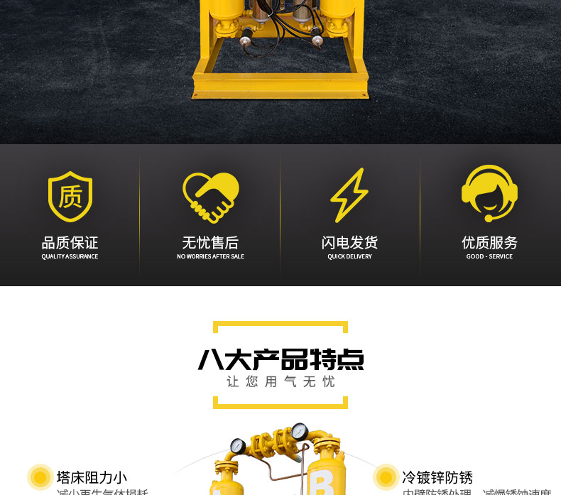 塔床阻力小,減少再生氣體損耗 冷鍍鋅防銹,內壁防銹處理,減慢銹蝕速度 30%干燥劑余量,補償干燥劑的自然老化 全電子編程控制器,人機界面友好、操作簡單 耐高壓吸附桶,穩定耐用