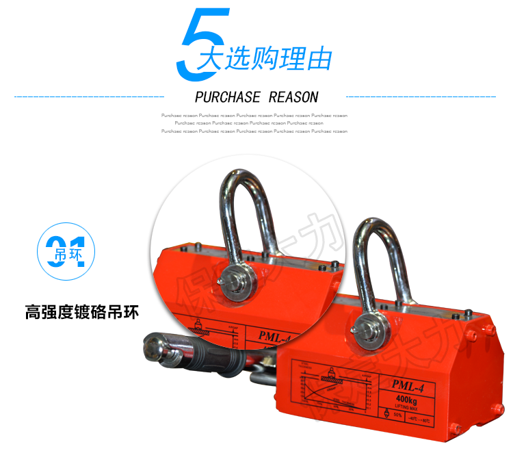 永磁起重器,全部采用N 4 O高牌號釹鐵繃為磁源,內(nèi)部磁路設(shè)計合理、結(jié)構(gòu)獨(dú)特、焊接材料特殊、密封性能好、外觀設(shè)計別致、定位正確。因此該產(chǎn)品與國內(nèi)同類產(chǎn)品相比、具有體積小、吸力大、剩磁小、軸頭不易斷裂、壽命長等各種優(yōu)點。