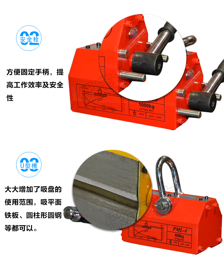 永磁起重器主要的一點不需用電。這種永磁起重器是一種無電源起重設(shè)備。永磁起重器吸力安全系數(shù)×3.5倍,永磁起重器采用高性能稀土永磁一釹鐵硼為磁源,具有不耗電,吸力強(qiáng)、剩磁低、操作輕便、壽命長、安全可靠等特點,永磁起重器結(jié)構(gòu)先進(jìn),按照出口標(biāo)準(zhǔn)組織生產(chǎn)。永磁起重器廣泛用于機(jī)械工業(yè)、模具制造業(yè)、倉庫和交通運(yùn)輸?shù)炔块T搬運(yùn)鋼板、鋼錠等導(dǎo)磁性物體。 永磁吸盤適用于搬運(yùn)鋼板、鐵塊及圓柱鐵材。如機(jī)械零件、沖床模具及各類鋼鐵材料。