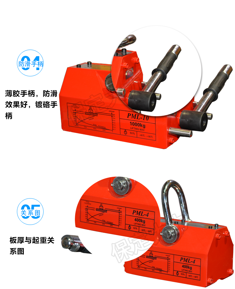 永磁起重器,全部采用N 4 O高牌號釹鐵繃為磁源,內(nèi)部磁路設(shè)計合理、結(jié)構(gòu)獨(dú)特、焊接材料特殊、密封性能好、外觀設(shè)計別致、定位正確。因此該產(chǎn)品與國內(nèi)同類產(chǎn)品相比、具有體積小、吸力大、剩磁小軸頭不易斷裂、壽命長等各種優(yōu)點。